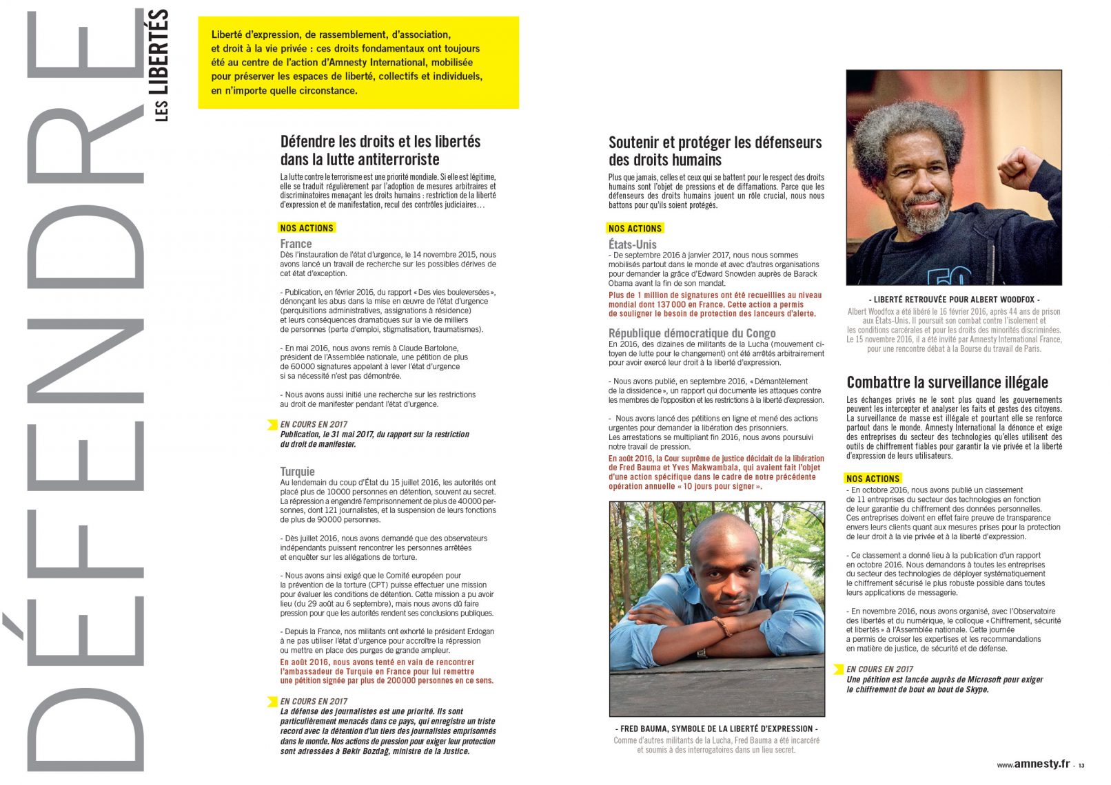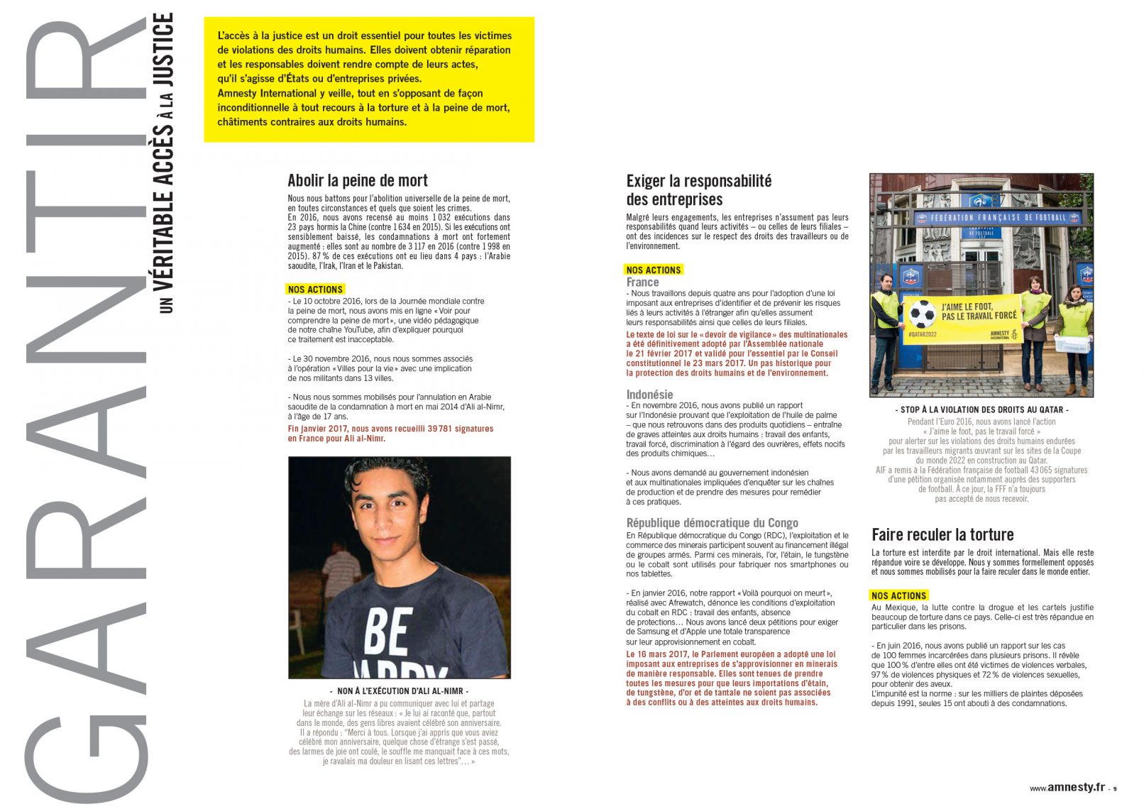 Client : Amnesty International (projet réalisé au sein de l’agence Accroche Com’)Année : 2016Missions : Création de couverture, refonte de la maquette, mise en page et pdf imprimeur